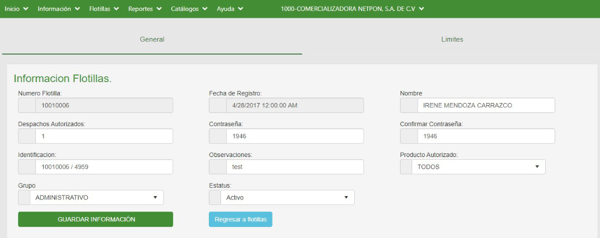 Si el Usuario es Administrador podrá modificar la información de la flotilla , caso contrario solo podrá consultar dicha flotilla.