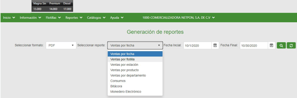 Esta sección permite generar diversos reportes de ventas y consumo de las flotillas, como ventas por fechas, por flotillas, por estaciones, y más. Los reportes pueden descargarse en formato PDF o Excel.