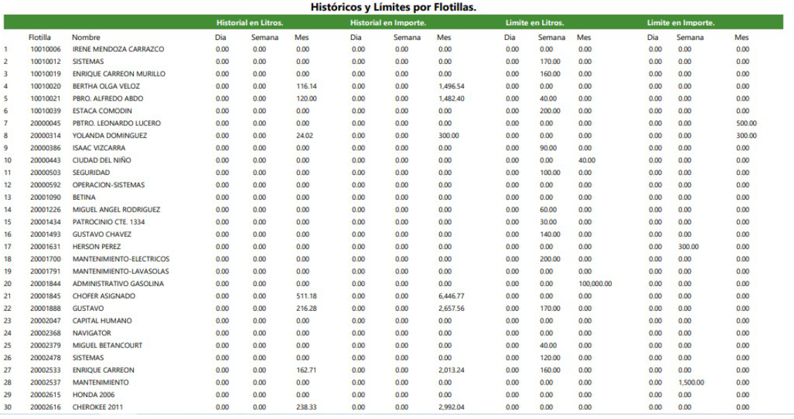 Permite revisar los registros históricos de consumo de cada flotilla, lo cual es útil para un control detallado de uso y seguimiento.